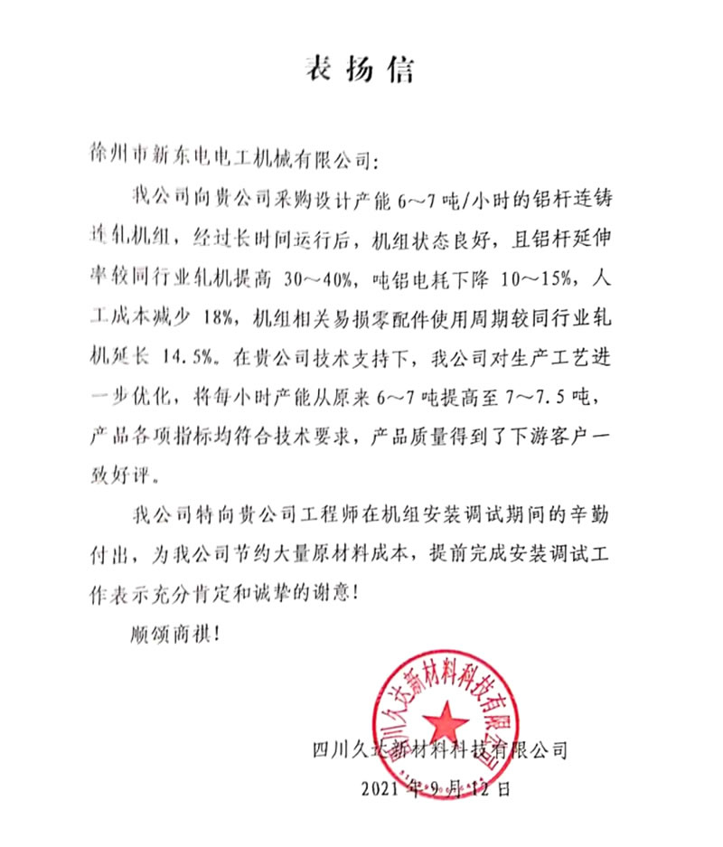 我公司向貴公司采購(gòu)設(shè)計(jì)產(chǎn)能6~7噸/小時(shí)的鋁桿連鑄連軋機(jī)組,經(jīng)過(guò)長(zhǎng)時(shí)間運(yùn)行后,機(jī)組狀態(tài)良好,且鋁桿延伸率較同行業(yè)軋機(jī)提高30~40%,噸鋁電耗下降10~15%,人工成本減少l8%,機(jī)組相關(guān)易損零配件使用周期較同行業(yè)軋機(jī)延長(zhǎng)14.5%。在貴公司技術(shù)支持下,我公司對(duì)生產(chǎn)工藝進(jìn)一步優(yōu)化,將每小時(shí)產(chǎn)能從原來(lái)6~7噸提高至7~7.5噸,產(chǎn)品各項(xiàng)指標(biāo)均符合技術(shù)要求,產(chǎn)品質(zhì)量得到了下游客戶一致好評(píng)。